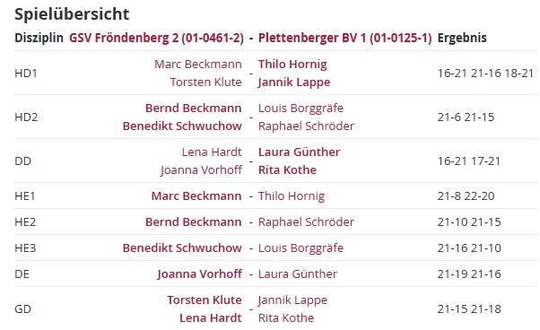Ein schweres Spiel liegt hinter der Mannschaft aus Plettenberg. Gegen den Tabellenzweiten konnte lediglich das 1. Herrendoppel – gespielt von Thilo Hornig und Jannik Lappe – das Spiel für sich entscheiden (16:21; 21:16; 18:21). In glatten zwei Sätzen gewannen allerdings die Plettenberger Damen, Laura Günther und Rita Kothe, das Damendoppel. Thilo Hornig stand im 1. Satz seines Einzels neben sich, steigerte sich jedoch im 2. Satz enorm, musste diesen Satz aber schließlich mit 22:20 an den Gegner abgeben. Für Raphael Schröder und Louis Borggräfe waren ihre jeweiligen Gegner aus Fröndenberg eine Nummer zu groß und sie unterlagen ihren Kontrahenten mehr oder weniger deutlich. Laura Günther kämpfte im Dameneinzel gegen eine konditionsstarke Gegnerin. Trotz aller Bemühungen musste sich die Plettenbergerin am Ende geschlagen geben. Im abschließenden Mixed spielten erstmals Jannik Lappe und Rita Kothe gegen eine eingespielte und routinierte Formation aus Fröndenberg, der sie am Ende den Vortritt lassen mussten.