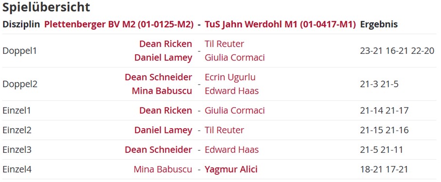 Unsere U17 bleibt weiterhin Tabellenführer dank eines 5:1-Erfolgs gegen Werdohl. Im ersten Doppel setzten sich Dean Ricken und Daniel Lamey in einem hart umkämpften Spiel durch, das über drei Sätze ging, von denen zwei erst in der Verlängerung entschieden wurden. Im zweiten Doppel dominierten Dean Schneider und Mina Babuscu klar und besiegten ihre Gegner zügig. Auch im dritten Einzel zeigte Dean Schneider seine Überlegenheit und sicherte einen weiteren Punkt. Im vierten Einzel trat Mina Babuscu gegen die körperlich stärkere Yagumur Alici an. Obwohl sie knapp verlor, setzte sie viele starke Akzente und holte einige beeindruckende Punkte. Die Einzel von Dean Ricken und Daniel Lamey waren von spannenden Ballwechseln geprägt, doch beide behielten am Ende die Oberhand und steuerten die letzten Punkte zum Endstand von 5:1 bei.